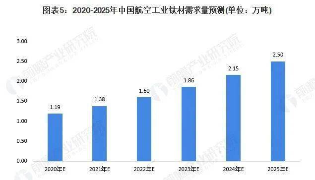 3、國內高端鈦合金市場(chǎng)呈“雙寡頭”競爭格局 在國內鈦合金市場(chǎng)中,目前能夠批量生產(chǎn)軍用航空鈦合金棒絲材的企業(yè)主要是:西部超導、寶鈦股份和湖南金天鈦業(yè)科技有限公司。 4、航空航天用鈦材需求前景廣闊 2009-2017年,中國航空航天用鈦材銷(xiāo)量的年復合增長(cháng)率為16%,同時(shí)考慮到國內目前航空航天用鈦材占比遠低于全球范圍內航空航天用鈦材占鈦材總需求的50%的比例,假設未來(lái)幾年年的復合增長(cháng)率保持不變,至2025年,我國航空工業(yè)鈦材需求量將達2.5萬(wàn)噸。