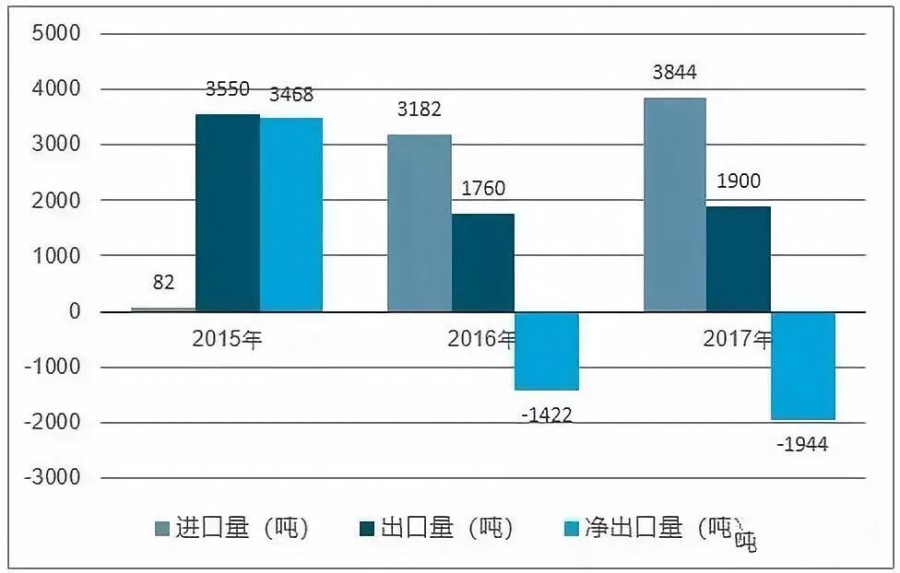 圖7 2015-2017年中國海綿鈦進(jìn)出口分析