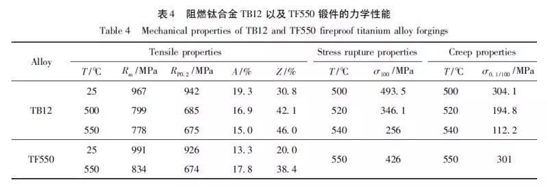 從表4 可見(jiàn),TF550 鈦合金鍛件的高溫持久和蠕變性能顯著(zhù)優(yōu)于TB12 鈦合金。
