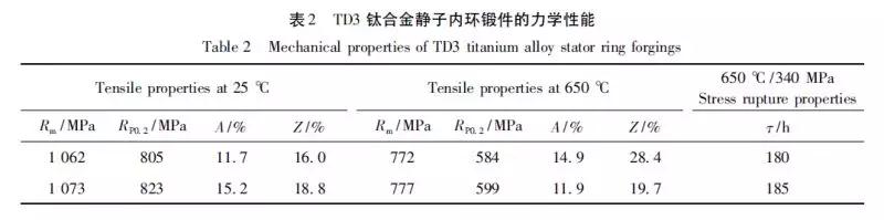 1. 4 整環(huán)和半環(huán)鍛件研制。以機匣、內環(huán)、安裝邊等為代表的環(huán)形件結構也是航空發(fā)動(dòng)機中比較重要的結構形式,環(huán)鍛件通常采用軋制工藝制造,主要工序為棒材坯料鐓粗、沖孔、擴孔和最終的軋制成形。通常,坯料沖孔后得到的環(huán)坯進(jìn)一步擴孔和最終的軋制成形都是在擴孔機上完成的。高溫鈦合金以及Ti3Al、Ti2AlNb 合金環(huán)鍛件制備都能夠采用這種工藝路線(xiàn),在環(huán)鍛件制備的4 個(gè)工序過(guò)程中,坯料的加熱溫度、擴孔和最終軋制成形的變形量控制決定了環(huán)鍛件的組織類(lèi)型,通過(guò)固溶、時(shí)效處理可以進(jìn)一步調控環(huán)鍛件的微觀(guān)組織,獲得所需的力學(xué)性能。圖7 和表2 分別為T(mén)D3 鈦合金靜子內環(huán)鍛件及其力學(xué)性能??梢?jiàn),TD3 鈦合金靜子內環(huán)鍛件的室溫和650 ℃力學(xué)性能均比較好。 圖7 TD3 鈦合金靜子內環(huán)鍛件照片 Fig. 7 Photo of TD3 titanium alloy stator ring forgings 相近變形條件下,TB12 和TF550 阻燃鈦合金的變形抗力顯著(zhù)高于普通鈦合金,甚至也高于Ti-Al 系金屬間化合物合金,如表3 所示??梢?jiàn),阻燃鈦合金環(huán)鍛件制備難度非常大。在成形外徑為730 mm、高度為300 mm 的TB12 鈦合金大型機匣環(huán)鍛件時(shí),遇到的最大問(wèn)題就是擴孔機噸位不足,坯料沖孔后得到的環(huán)坯徑向截面厚度仍較大,不能在擴孔機上直接進(jìn)行擴孔,只能采用變形條件比較差的馬架擴孔工藝將環(huán)坯的徑向截面尺寸先進(jìn)行減薄,然后再在擴孔機上完成環(huán)鍛件的軋制成形,圖8a 為T(mén)B12鈦合金軋制成形的機匣環(huán)鍛件。