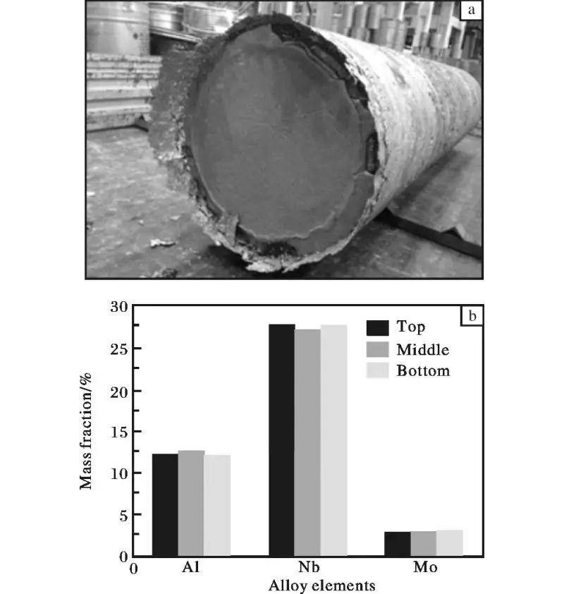 目前的解決方法主要是優(yōu)選中間合金和優(yōu)化混布料工藝。圖1 為北京航空材料研究院采用真空自耗熔煉工藝制備的TD3 鈦合金3 t 鑄錠(