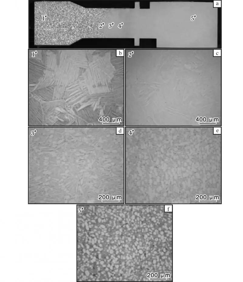 鈦合金盤(pán)和葉片一體化制造在組織性能控制上做了一種工藝上的妥協(xié),為了能夠充分發(fā)揮高溫鈦合金各種微觀(guān)組織形態(tài)或合金最優(yōu)勢的性能,近些年嘗試開(kāi)展了雙合金整體葉盤(pán)以及雙性能整體葉盤(pán)的研制工作,主要包括: ①線(xiàn)性摩擦焊工藝,理論上可以實(shí)現雙合金或是同一合金雙組織整體葉盤(pán)的連接,國內外的研究工作主要集中于線(xiàn)性摩擦焊工藝和接頭組織性能的研究; ②真空電子束焊接+ 近等溫鍛造+ 熱處理強化界面的復合工藝,西北工業(yè)大學(xué)采用這種工藝開(kāi)展了Ti3Al /TC4、Ti3Al /TC11、Ti2AlNb /TC11、Ti2AlNb /Ti60雙合金盤(pán)研制的基礎研究和組織性能評估; ③分區控溫鍛造和分區控溫熱處理工藝,理論上能夠將整體葉盤(pán)鍛件中葉片與盤(pán)體控制為不同的組織類(lèi)型,以更好地滿(mǎn)足整體葉盤(pán)不同部位實(shí)際服役條件的要求。圖6為T(mén)A29 鈦合金 圖6 TA29 鈦合金雙性能整體葉盤(pán)鍛件徑向截面 低倍組織和顯微組織 Fig. 6 Radial section macrostructure( a) and microstructures( b ~ f) of TA29 titanium alloy dual-property blisk die forging