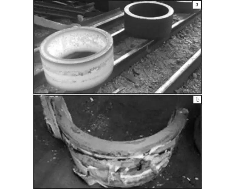 Ti-V-Cr 系阻燃鈦合金的顯著(zhù)特點(diǎn)是鑄造組織狀態(tài)下工藝塑性非常低,基本不能實(shí)現無(wú)約束條件下自由鍛造。2009—2010 年,北京航空材料研究院與北方重工合作,在360MN 擠壓機上實(shí)現了TB12 和TF550 鈦合金多個(gè)3 t 級鑄錠的包套擠壓開(kāi)坯。圖2為